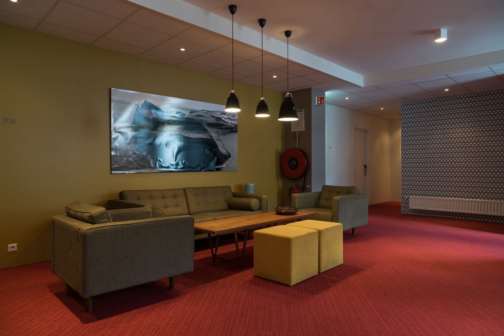 Á 1. hæð er lítill salur þar sem hægt er að njóta samveru við hina gestina. Á annarri og þriðju hæð eru svo setustofur með sófum, leikhorni fyrir börnin og tölvu.